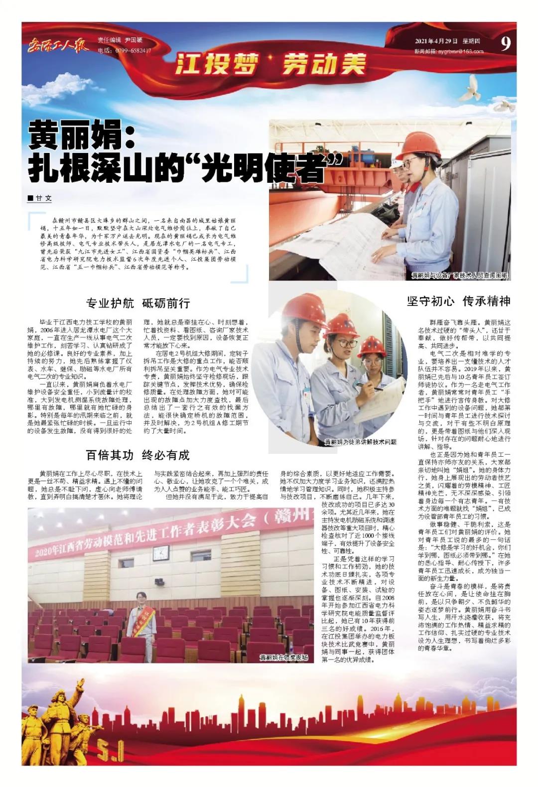 在赣州市赣县区大埠乡的群山之间,一名来自南昌的城里姑娘黄丽娟,十五年如一日,默默坚守在大山深处电气维修岗位上,奉献了自己最美的青春年华,为千家万户送去光明。现在的黄丽娟已成长为电气维修高级技师、电气专业技术带头人,是居龙潭水电厂的一名电气专工,曾先后荣获“九江市先进女工”、江西省国资委“巾帼英雄标兵”、江西省电力科学研究院电力技术监督6次年度先进个人、江投集团劳动模范、江西省“五一巾帼标兵”、江西省劳动模范等称号。